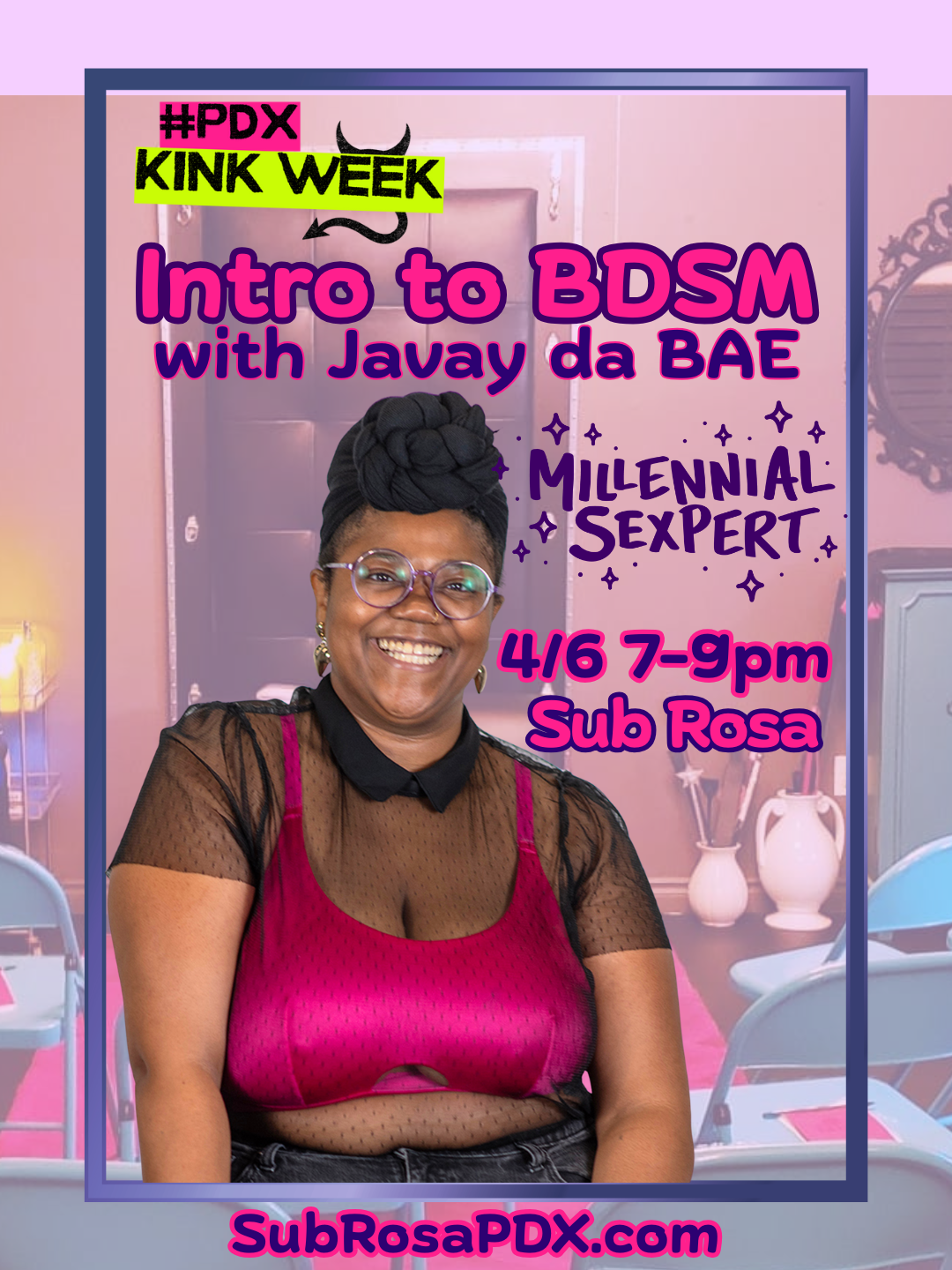 If PDX Kink Week is igniting a fire or curiosity in you, come explore some beginner-friendly kink & BDSM activities at Sub Rosawith Javay da BAE, aka The Millennial Sexpert. Learn skills in Portland’s most delicious dungeon playspace. Limited spots!